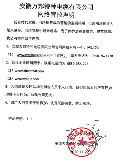 鄭重聲明:安徽萬邦特種電纜有限公司官方網站為:www_wanbangcable_com.pdlpr.cn,除此之外無任何子網站或合作網站,其余均為假冒偽劣。電話:0550-7621728 13485756353 地 址:安徽省天長市滁州高新技術產業開發區經四路29號
